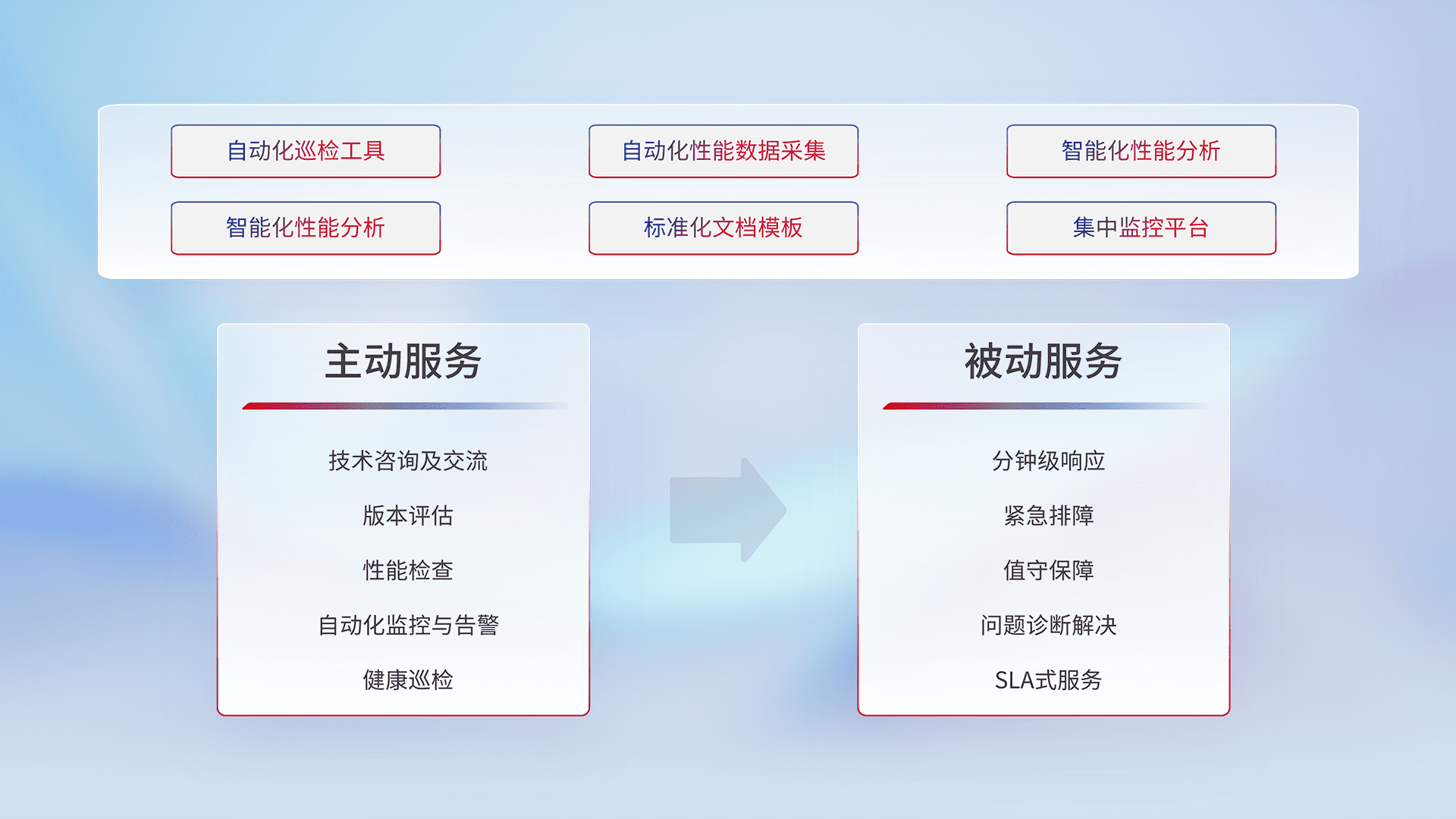 智能化工具和标准化文档,,保障服务质量,,提供主动服务(包含技术咨询、、、、版本评估、、性能检查、、、自动化监控与告警、、健康巡检)和被动服务包含(分钟级响应、、紧急排障、、、、值守保障、、、问题诊断解决、、SLA服务)。。。。